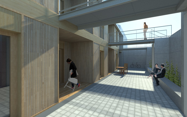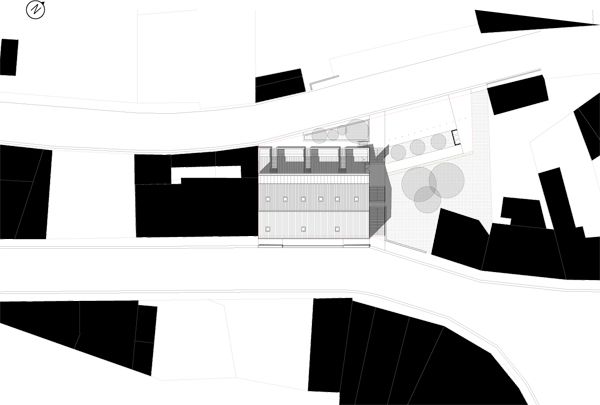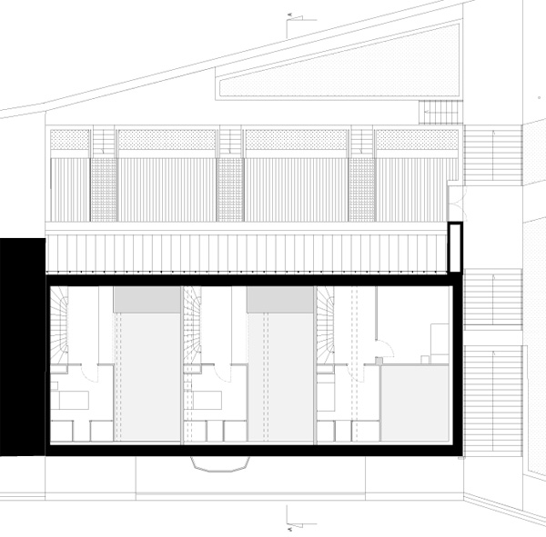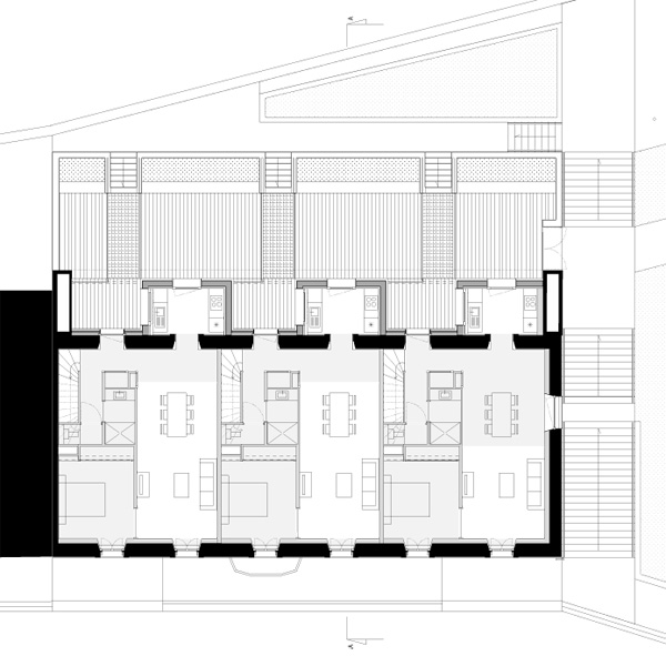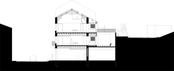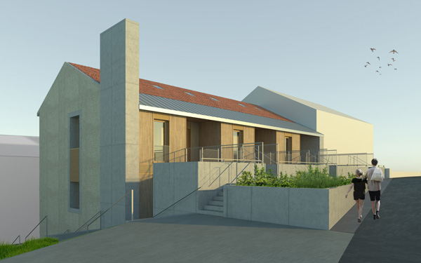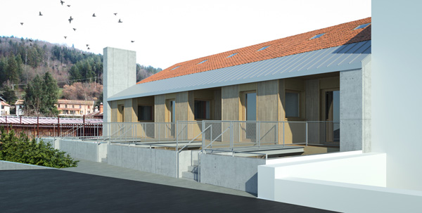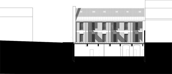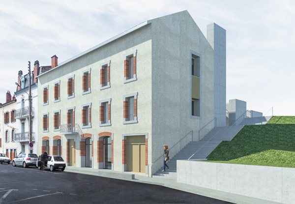 Ces transformations en rez-de-chaussée impliquent d’adresser les nouveaux logements côté rue du 11 Novembre. Une extension sur deux niveaux est adossée à l’édifice le long de la façade nord-ouest qui s’ouvre désormais sur une cour prenant place sur le sous-sol commercial. Elle comprend une cuisine et une loggia pour chacun des 6 logements créés. Trois logements de type 2, adaptés aux personnes à mobilité réduite, sont desservis par la cour commune, accessible depuis l’espace public par un escalier et une rampe qui la relie à l’aire de stationnement. Cette offre de logements répond à la demande d’une population rurale vieillissante et désireuse d’habiter dans le centre bourg à proximité des commerces et des services. Le maintien dans le centre bourg de ces populations fragiles contribue, en retour, au maintien de ses activités.