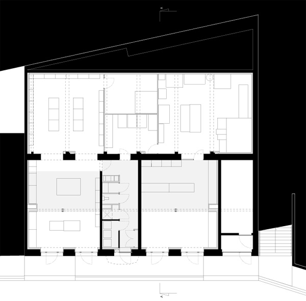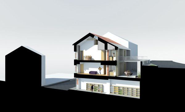 Dans le but d’accueillir confortablement une épicerie et une nouvelle boulangerie, le projet architectural propose d’agrandir la surface commerciale du rez-de-chaussée par deux actions : la suppression de la circulation verticale originelle libérant ainsi la partie centrale de l’édifice et la démolition puis reconstruction de l’extension en rez-de-chaussée prolongeant les activités commerciales au nord-ouest entre l’édifice et la paroi rocheuse.