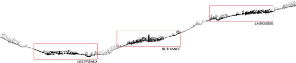 Coupe sur 3 scenarii de projets : les hameaux des Préaux et de la Biousse et le centre-bpurg de Ruthianges