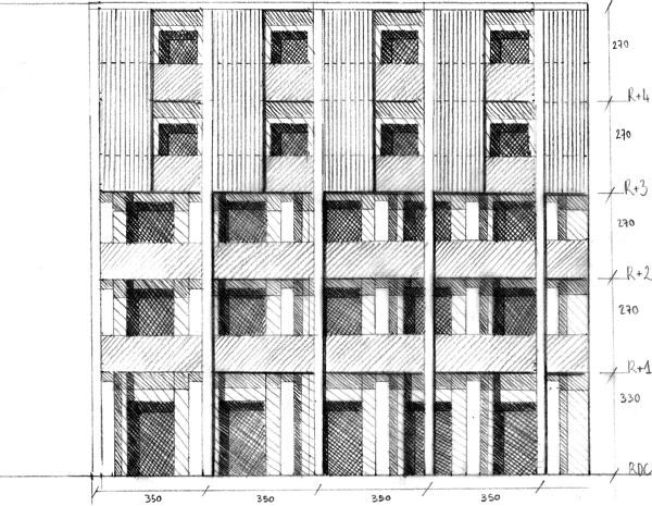 Croquis de la façade Sud réhabilitée d’un des bâtiments des Genêts